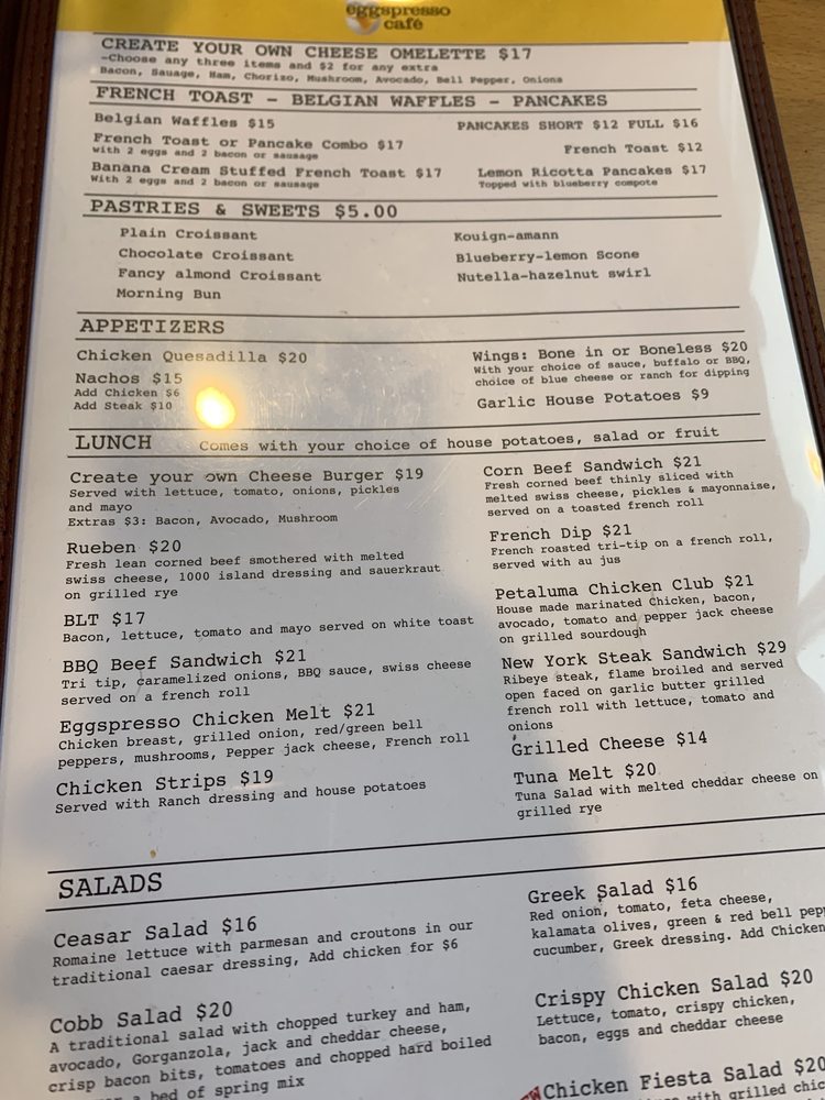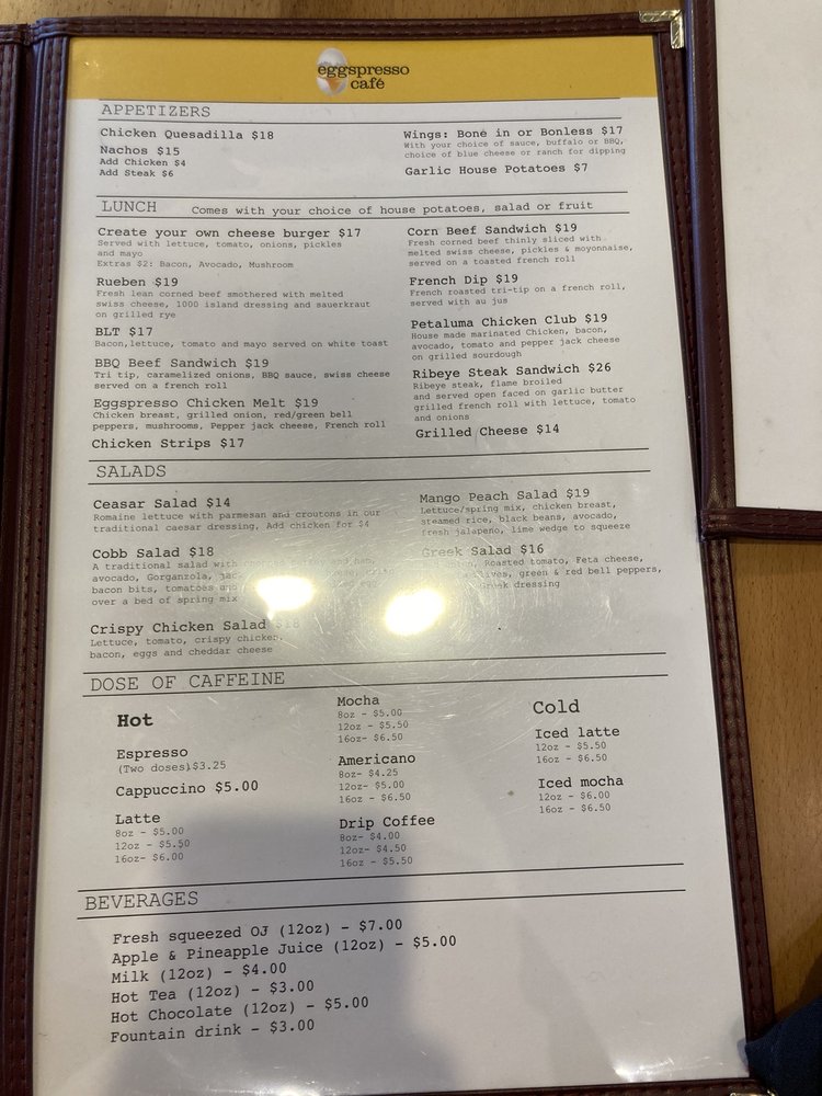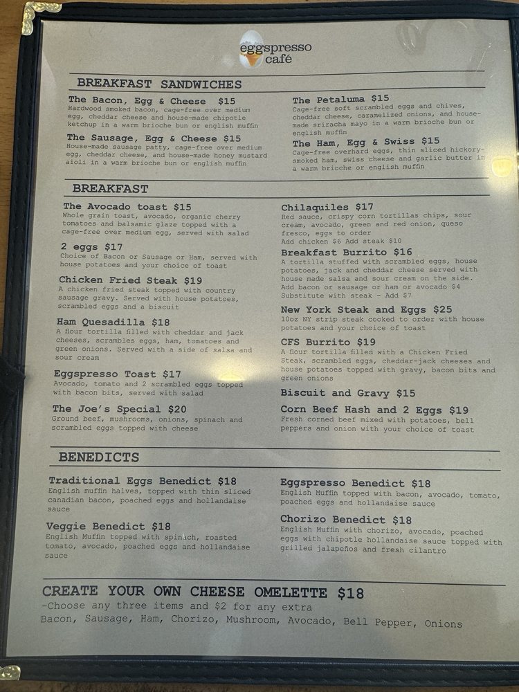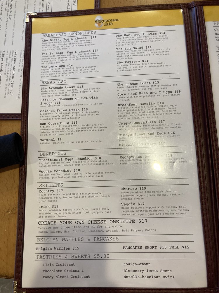 Introducing Eggspresso, a breakfast and brunch spot in Petaluma, CA. Eggspresso offers a diverse menu with many vegetarian options, perfect for groups looking for a casual and trendy dining experience. The cafe provides delivery, takeout, and catering services, along with waiter service and free Wi-Fi. Customers praise the friendly service and delicious food, with standout items like the Petaluma chicken club and sausage, egg, and cheese breakfast sandwich on brioche. The ambiance is welcoming with ample seating and a family-friendly atmosphere. While some dishes may benefit from added protein or more sauce, the overall experience at Eggspresso is one of comfort and satisfaction. Don't miss out on their gourmet breakfast sandwiches and inviting vibe on your next visit.